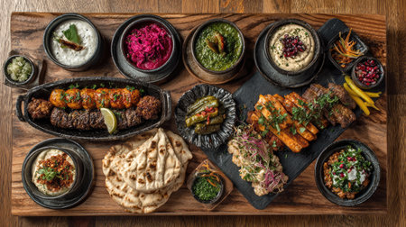 A stunning display of Middle Eastern cuisine featuring a variety of grilled meats, flavorful dips, and fresh flatbreads on a rustic wooden table. Perfect for food lovers.