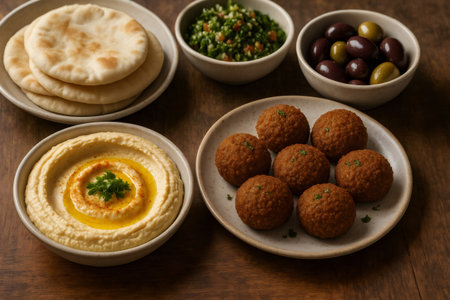 Delicious middle eastern spread with hummus, falafel, and bread on rustic table. That the image is generated using AI.