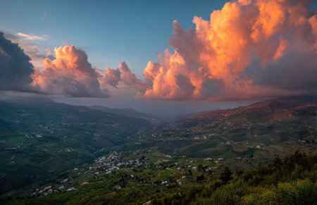 Mountains cradle valleys with vibrant green landscape and clouds illuminated by golden hour