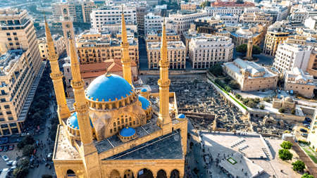 aerial drone shot of Al Amin mosque in Beirut, Lebanon downtown.