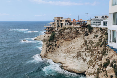 Beirut, Lebanon — 24.04.2023: Abandoned restaurant on the waterfront of Beirut overlooking the famous Pigeon Rocks
