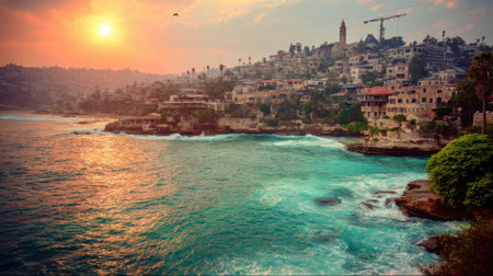 A stunning landscape view of a coastal city during a vibrant sunset. The sun casts a warm glow over the buildings on the cliffs and the beautiful turquoise water of the ocean.