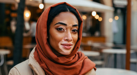 Confident middle eastern young adult female in urban cafe setting with warm lighting