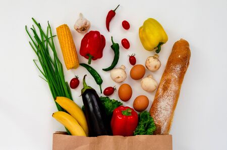Healthy food background. Healthy food in full paper bag of different products on white background.
