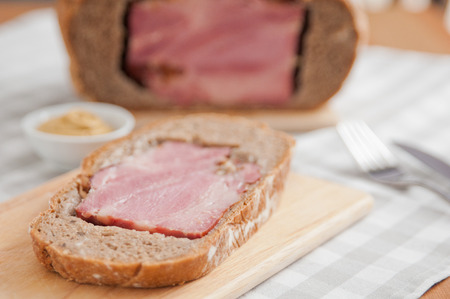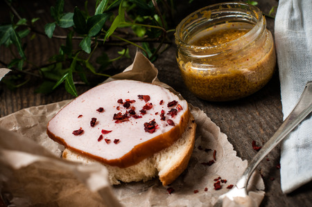 Simple rustic homemade food: a sandwich with ham and mustard on an old wooden table