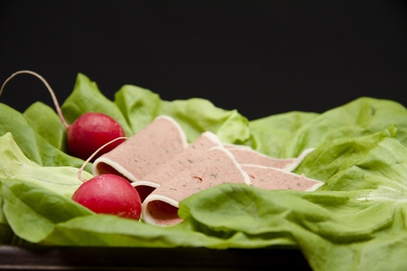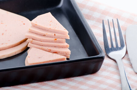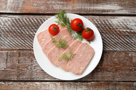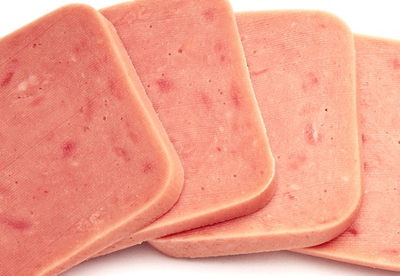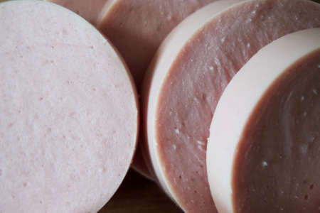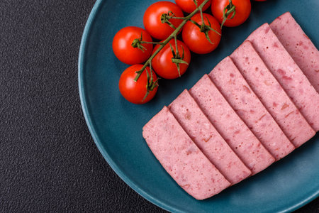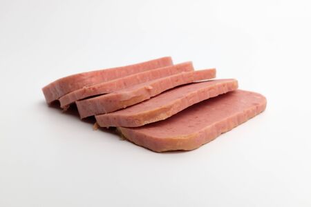 Spiced ham slices, canned meat for lunch sandwiches. Spiced ham as a food backdrop for your design.