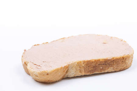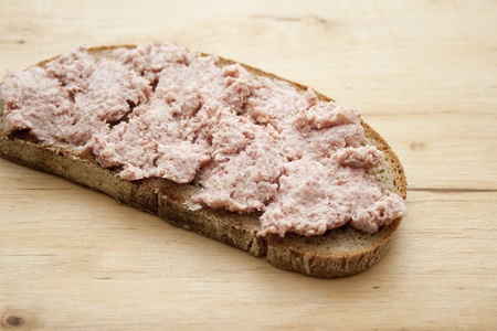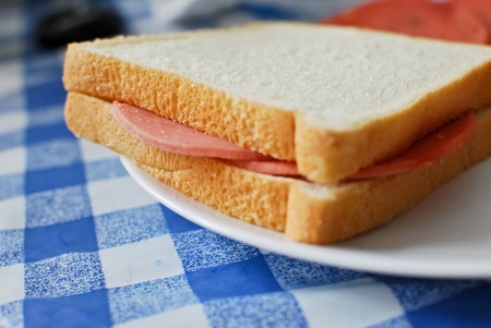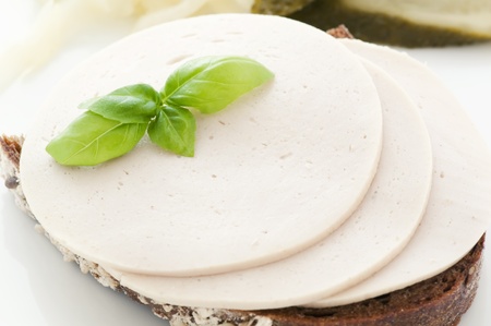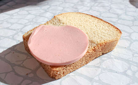 A cut-off piece of bread with a piece of boiled sausage on it. A quick snack when you're in a hurry.