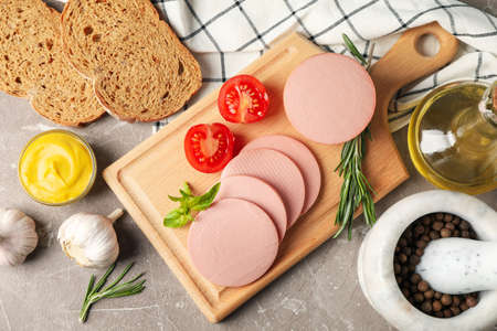 sandwich of rye bread with boiled sausage and vegetables on a rustic wooden background