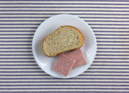 Top view of a pressed pork canned meat sandwich on wheat bread with two chunks to the side on a white plate atop a blue striped tablecloth.