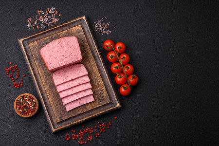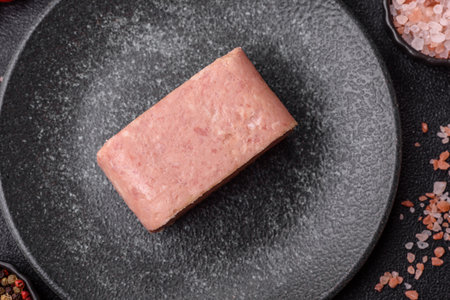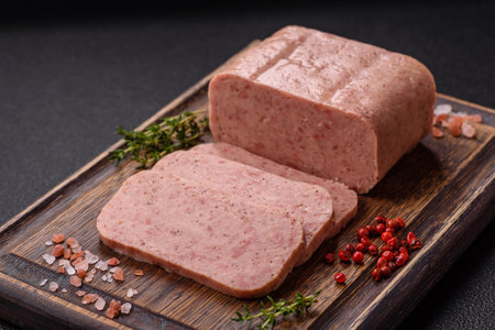 Delicious canned pink spiced ham or spam with salt, spices and herbs on a dark background