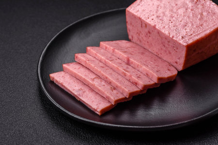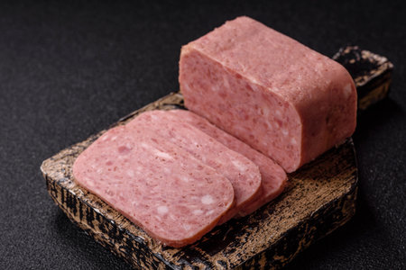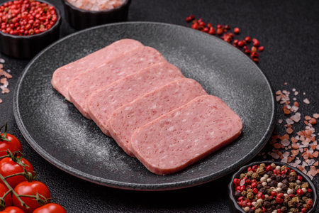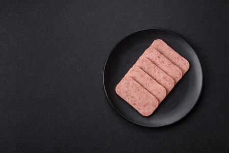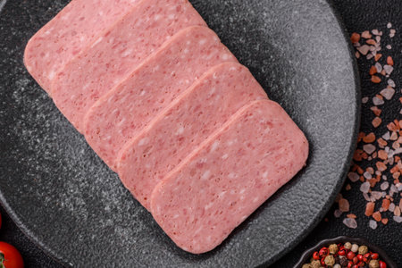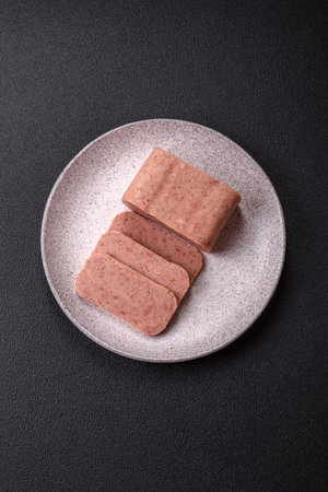 Canned ham, meat, pork, with spices and salt, slices on a dark concrete background