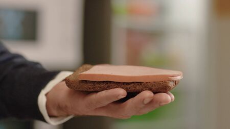 Close-up of slice of sausage on bread. Stock footage. Mans hand holds piece of bread on which appetizing slice of sausage falls on blurred kitchen background
