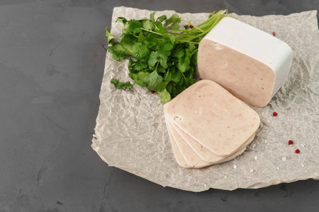 Raw Tempeh or Tempe, made of fermented soybean seeds on kitchen table. Tempeh Slices on plate with herbs. Soya protein. Plant based meat concept. Healthy eating. Go vegan. Selective focus, copy space