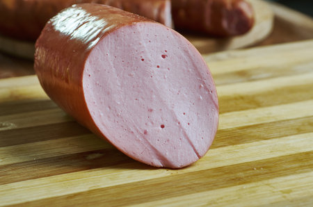 Boiled sausage cut into large chunks. Sausage, a close-up shot.