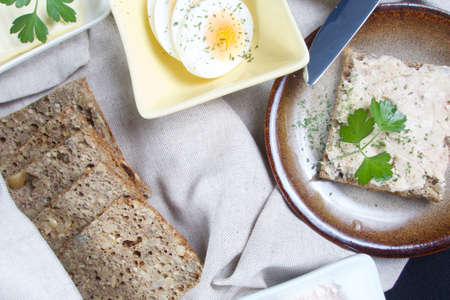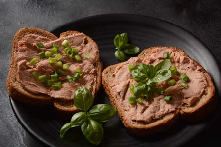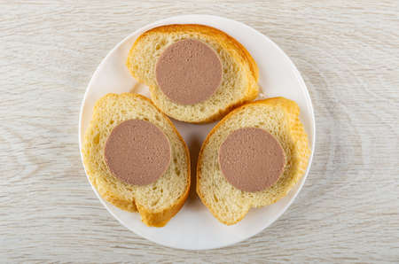Sandwiches with liver sausage in white plate on wooden table. Top view