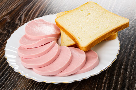 Slices of bread for toast and slices of sausage in white plate on dark wooden table