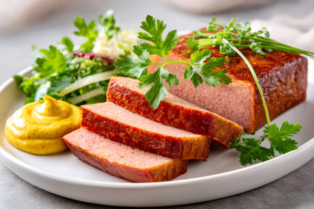 Delicious meatloaf slices garnished with parsley served with mustard and fresh salad