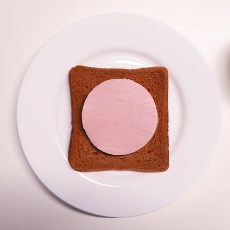 Top view of open sandwich made of wheat bread and slice of round shaped sausage. Yummy simple lunch served on white plate. Fast food and break for brunch concept