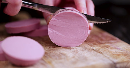 Sliced boiled delicious sausage on electronic scales, calorie counting, proper nutrition