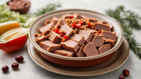 Slices of boiled beef liver with spices and herbs in a ceramic plate on a white marble background.