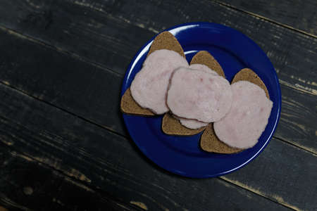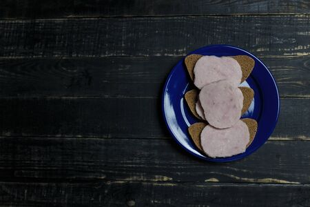 Sandwich of dark bread and sausage slices on blue plate standing on black wooden background. Tasty unhealthy food. Diet, nutrition, eating habits concept. Place for text