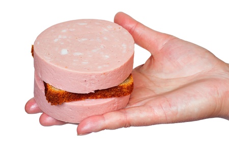 sandwich with boiled sausage lying on a palm it is isolated on a white background