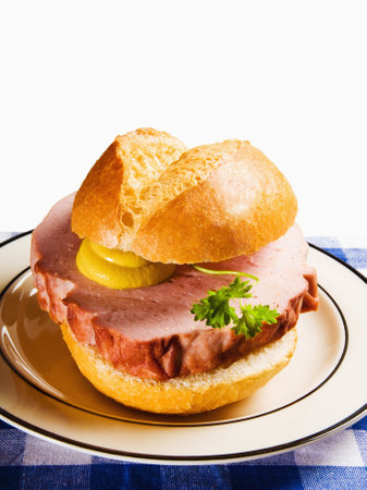 Bread with juicy boiled pork on a ceramic plate on a white background