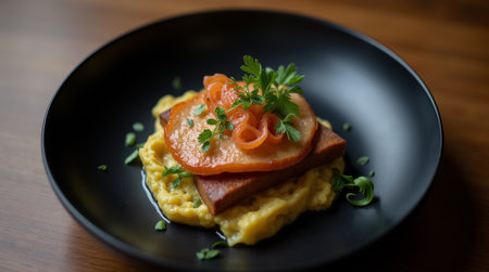 A beautifully arranged breakfast dish presents sauteed vegetables and slices of ham on a creamy base, garnished with fresh herbs for an appetizing touch.