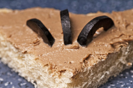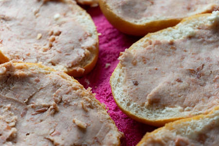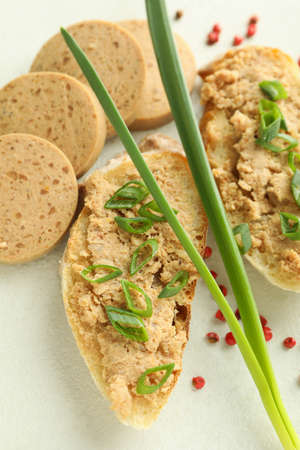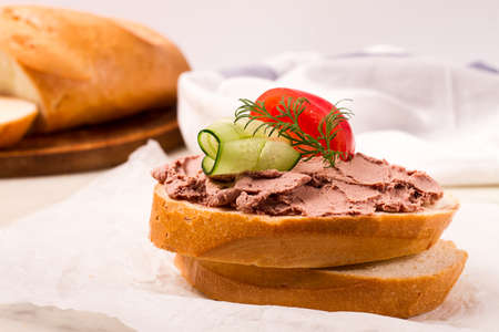 Liver meat pate spread, on white bread, on a light background, breakfast, close-up, no people, selective focus, pasticcio, pastete,