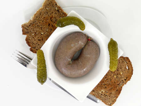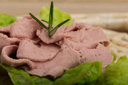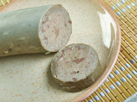 English liver sausage, creamy to firm cooked sausage containing ground pork liver