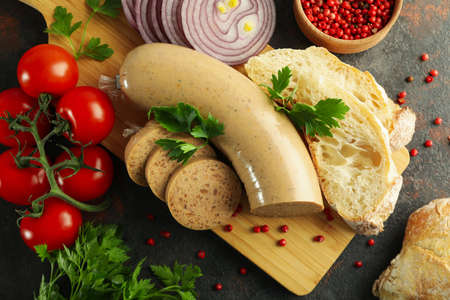 Food, meat and delicious concept - sausages made with horse meat with tomatoes on table