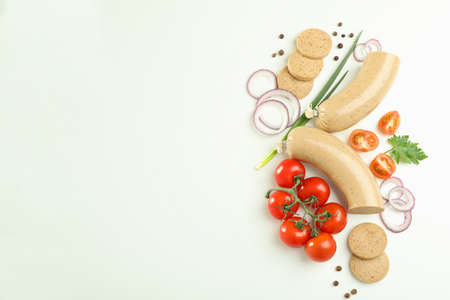 Sliced pork bolgna meat on a rustic wooden board on a white wooden surface, top view. Flat lay, overhead, from above.