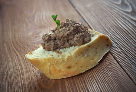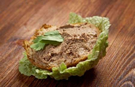 Fresh homemade chicken liver pate with herbs for bread on a natural wooden table. A sandwich.