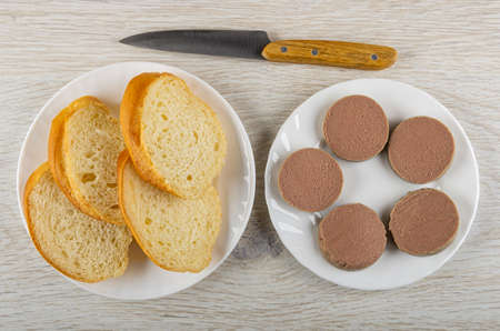 Slices of wheat bread in plate, pieces of liver sausage in white plate, kitchen knife on wooden table. Top view