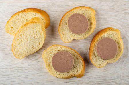 Slices of wheat bread, sandwiches with liver sausage on wooden table. Top view