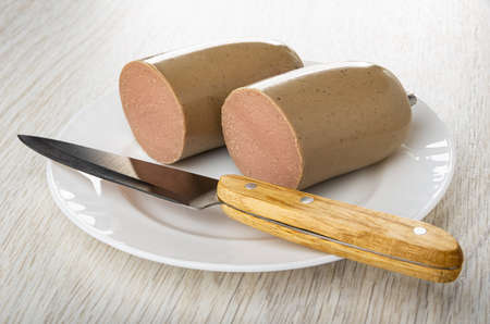 Halves of liver sausage in polyethylene shell, kitchen knife in white plate on wooden table