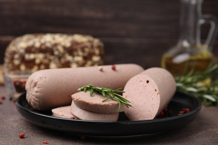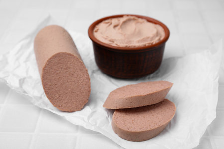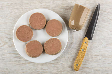 Pieces of liver sausage in white plate, half of liver sausage in polyethylene shell, kitchen knife on wooden table. Top view
