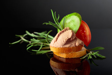 Bread slices with pate, tomato, cucumber, red pepper, and rosemary. Snack on a black reflective background.