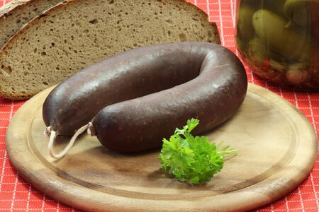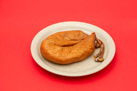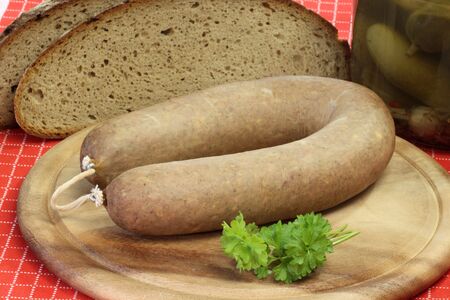 smoked homemade sausage on a wooden background and an old wooden hot smoked sausage