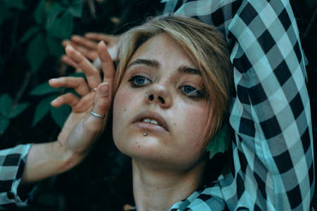 Beautiful young girl portrait in the forest. Forest area, nature. Art photo of the model in nature.