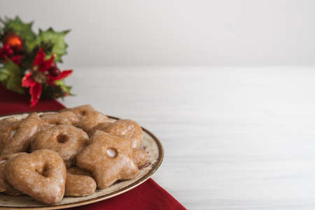 Assortment of Nuremberg Christmas Cookies on a Plate on a White Wooden Table with Selective Focus and Copy Space