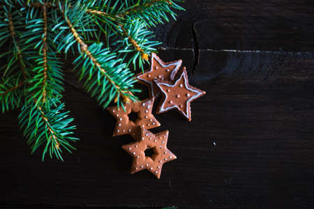 Merry Christmas. Festive gingerbread cookies with anise, cinnamon, pine cones, cedar branches and golden lights bokeh on rustic table. Atmospheric image. Seasons greetings