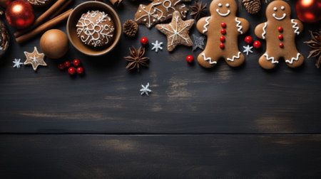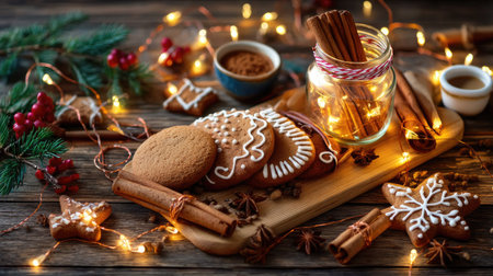 A warm display of holiday cookies, spices, and a cup of cocoa creates a cozy atmosphere. Gingerbread shapes and cinnamon sticks enhance the festive mood during winter.