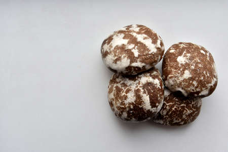 Typical German gingerbread cookies on a white background.Traditional Christmas treat. Bakery products, top view, copy space.