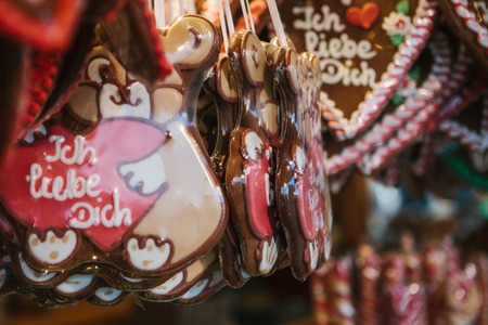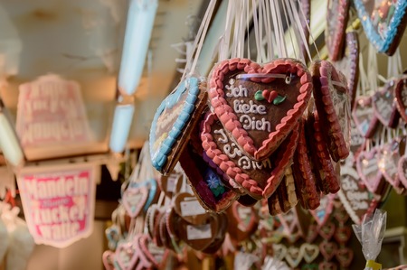 Traditional gingerbread hearts at the Christmas market in Fulda, Germany, Translation - I love you