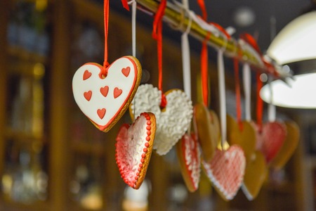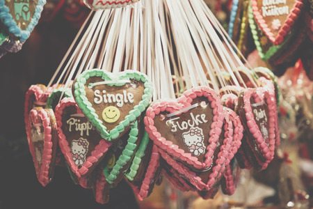 Gingerbread Hearts at German Christmas Market. Berlin. Traditional ginger bread cookies.
