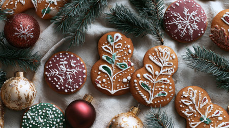 Capture the essence of the holiday season with these beautifully decorated gingerbread cookies surrounded by festive ornaments and pine branches. Perfect for celebrating Christmas.