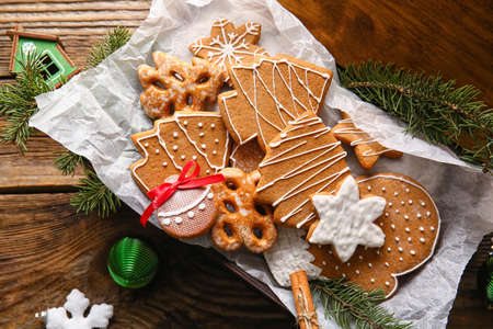Christmas gingerbread cookies in a plate on a wooden table with Christmas decorations
