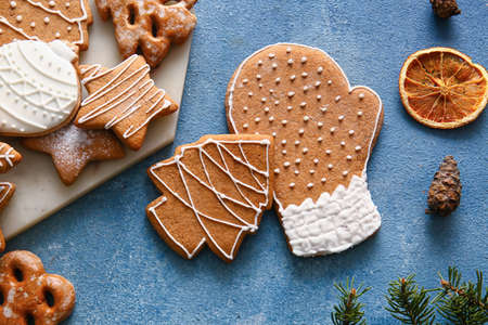 Traditional Christmas cookies. Homemade sweet decorated gingerbread biscuits with icing
