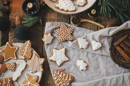 Christmas gingerbread cookies on rustic table with napkin, candle, decorations, spices. Flat lay. Atmospheric moody image. Stylish decorated christmas gingerbread cookies. Happy Holidays!